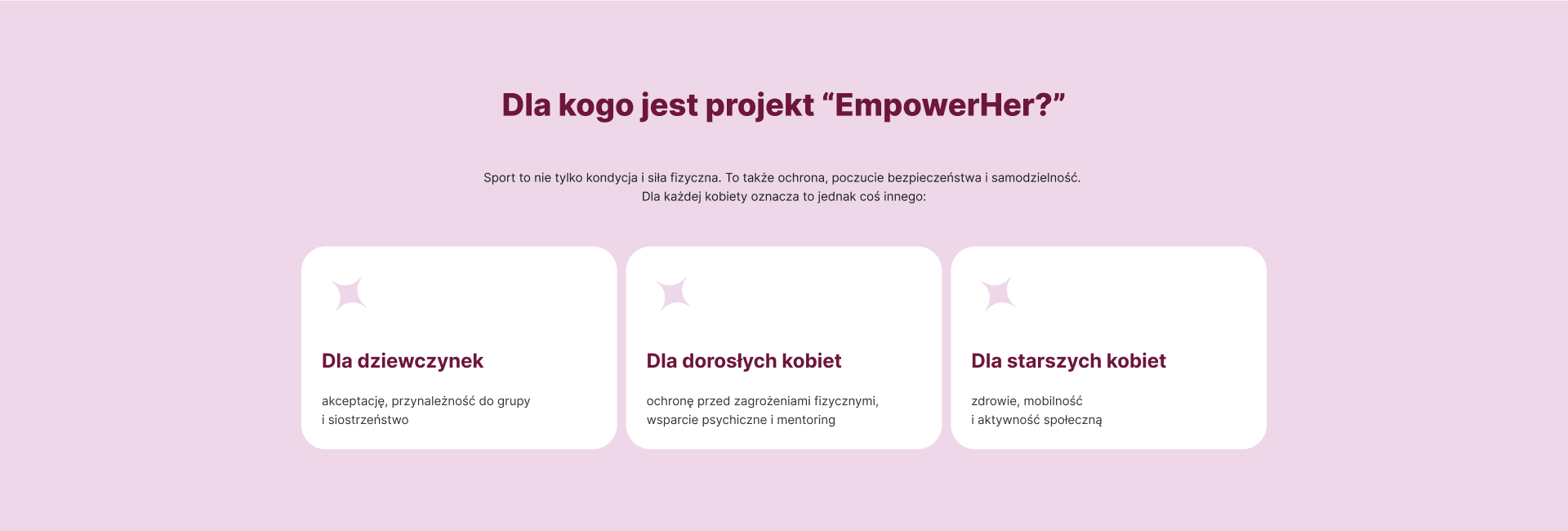 Projekt EmpowerHer – Kobieca Siła powstał z myślą o tworzeniu przestrzeni, w której kobiety i dziewczynki mogą rozwijać swoją sprawność fizyczną, wzmacniać poczucie bezpieczeństwa i odkrywać siłę płynącą ze wspólnoty.