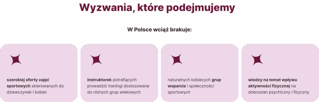 Naszym długofalowym celem jest promowanie aktywności ruchowej na różnych etapach życia, z uwzględnieniem specyficznych potrzeb kobiet – od najmłodszych, przez dorosłe, aż po seniorki.